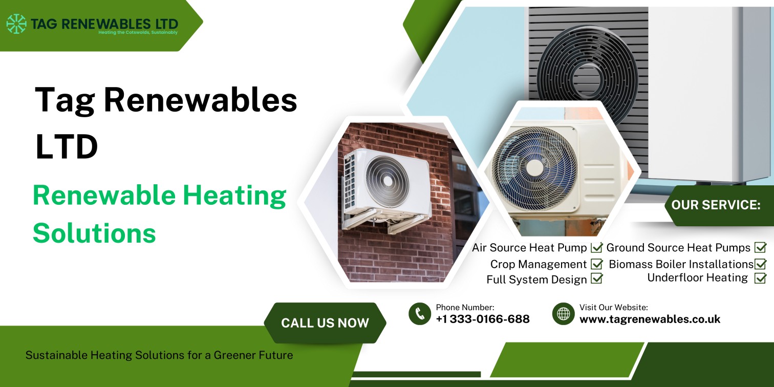 TAG Renewables Ltd is a family-run, UK-based specialist in low-carbon heating solutions, proudly "Heating the Cotswolds Sustainably" for homeowners and businesses.We are dealing in air source and ground source heat pumps, biomass boilers, underfloor heating, radiator systems with smart controls, and servicing/maintenanceโwhile also supporting traditional gas and oil boiler systems.