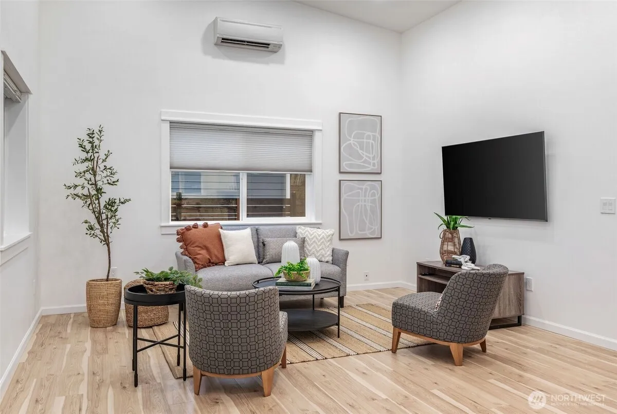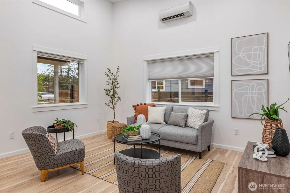 Nearly new, bright, sunny south-facing home close in to both Uptown and Downtown β€” a standout among new homes for sale in Port Townsend. The great room concept with vaulted ceilings and skylights allows this charming house to live larger than its square footage.
