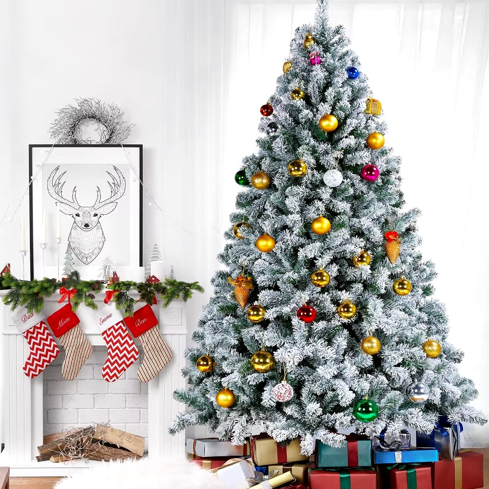• Premium Quality Material: Jump into the holiday joy with this lush artificial tree. All branches and tips are made of premium PVC, nicely covered with flocking snow which delivers traditional vibes with harmless and durable materials. Our PVC tips and branches are fire-resistant, feel free to put on lights or other ornaments. Both the tree trunk and the stand are made of iron, ensuring sturdy and balanced placement