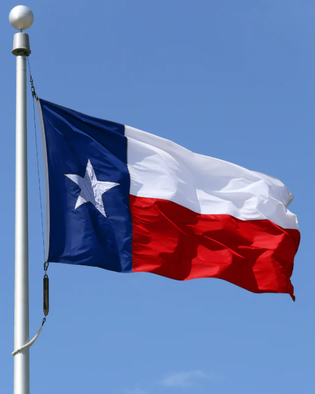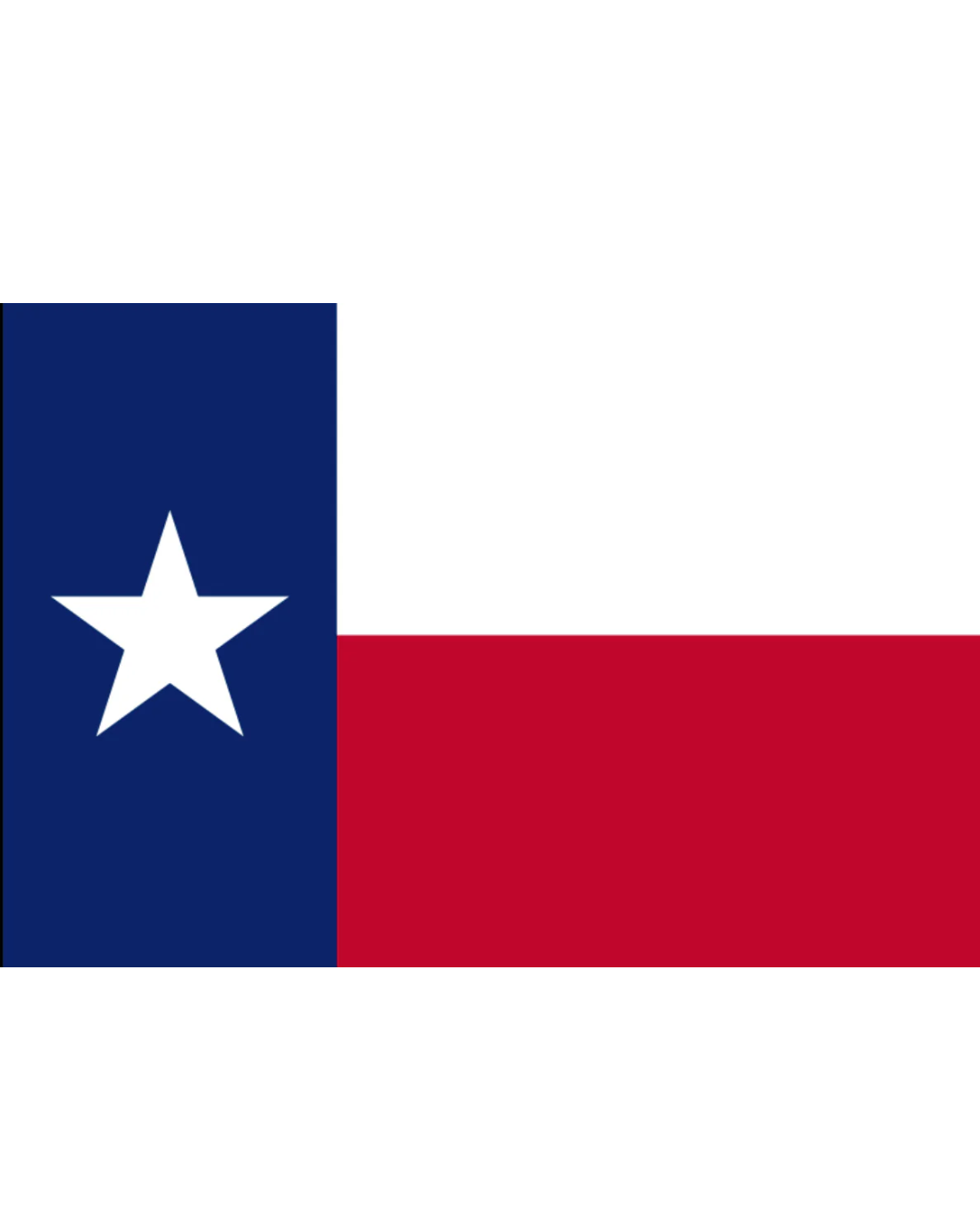 The Texas flag is recognizable everywhere, out of state and even out of country. The Lone star state has a flag with the white lone star centered in the hoist in a blue stripe. The remainder of the flag is two horizontal stripes white over red.